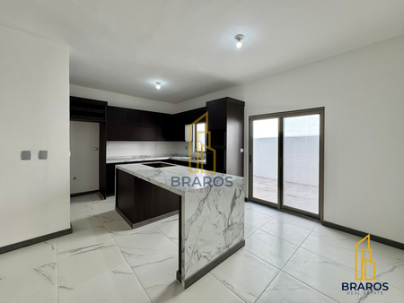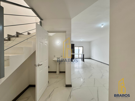 Área de sala comedor y cocina abierta, medio baño, lavandería, cochera completamente techada para 2 autos, patio.
